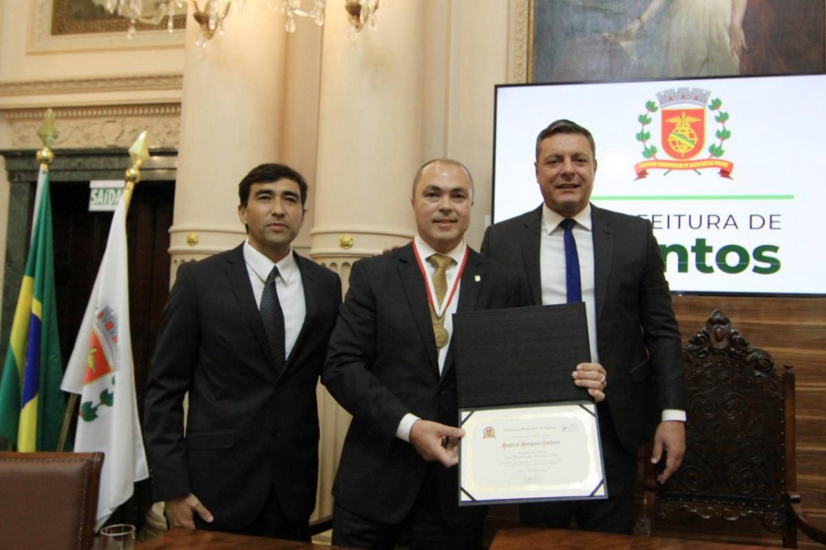 Para encerrar com maestria a semana de comemoração aos 30 anos da medalha de ouro nos Jogos Olímpicos Barcelona 1992, o ex-judoca Rogério Sampaio recebeu uma grande homenagem em sua cidade natal. A maior honraria da cidade de Santos foi concedida ao diretor-geral do Comitê Olímpico do Brasil (COB) na noite desta sexta-feira (5). Em cerimônia no Palácio José Bonifácio, sede da prefeitura municipal, o santista recebeu a medalha e o diploma do mérito José Bonifácio de Andrada e Silva na presença de autoridades locais, familiares e amigos.